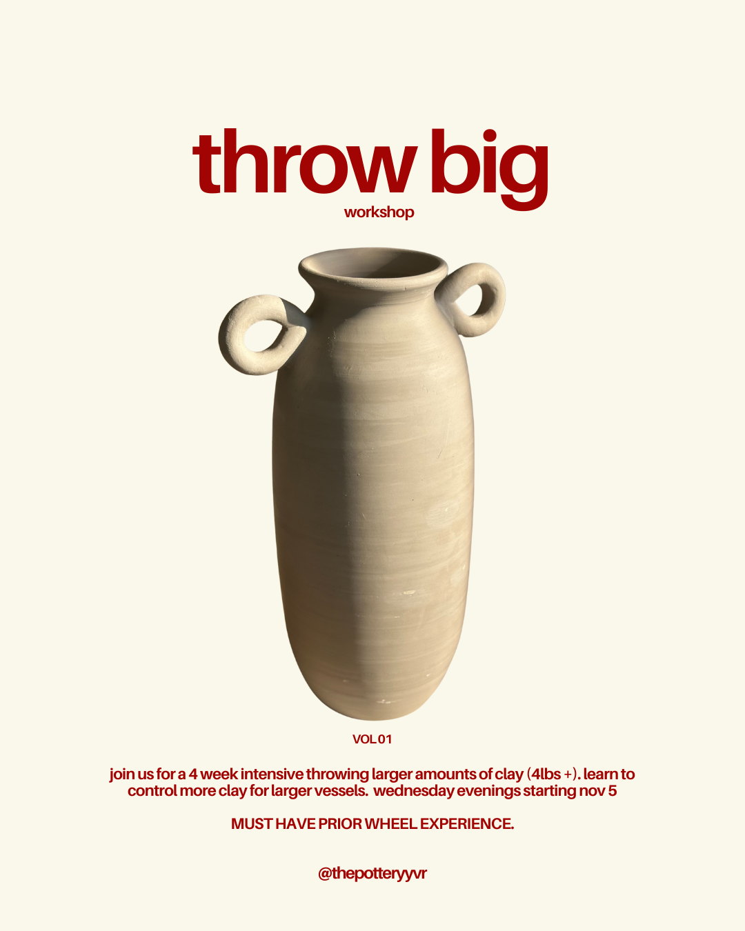 Ready to size up your throwing skills? This 4-week intensive workshop is designed for potters looking to push beyond smaller forms and confidently work with larger amounts of clay (4 lbs +).