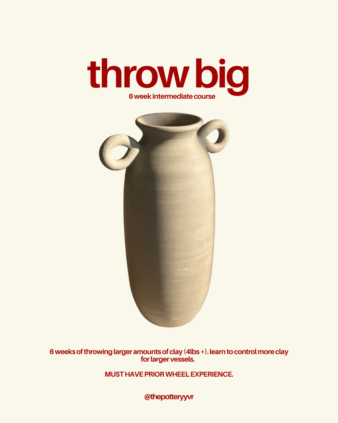 Ready to size up your throwing skills? This 6-week intermediate workshop is designed for potters looking to push beyond smaller forms and confidently work with larger amounts of clay (4 lbs +).
